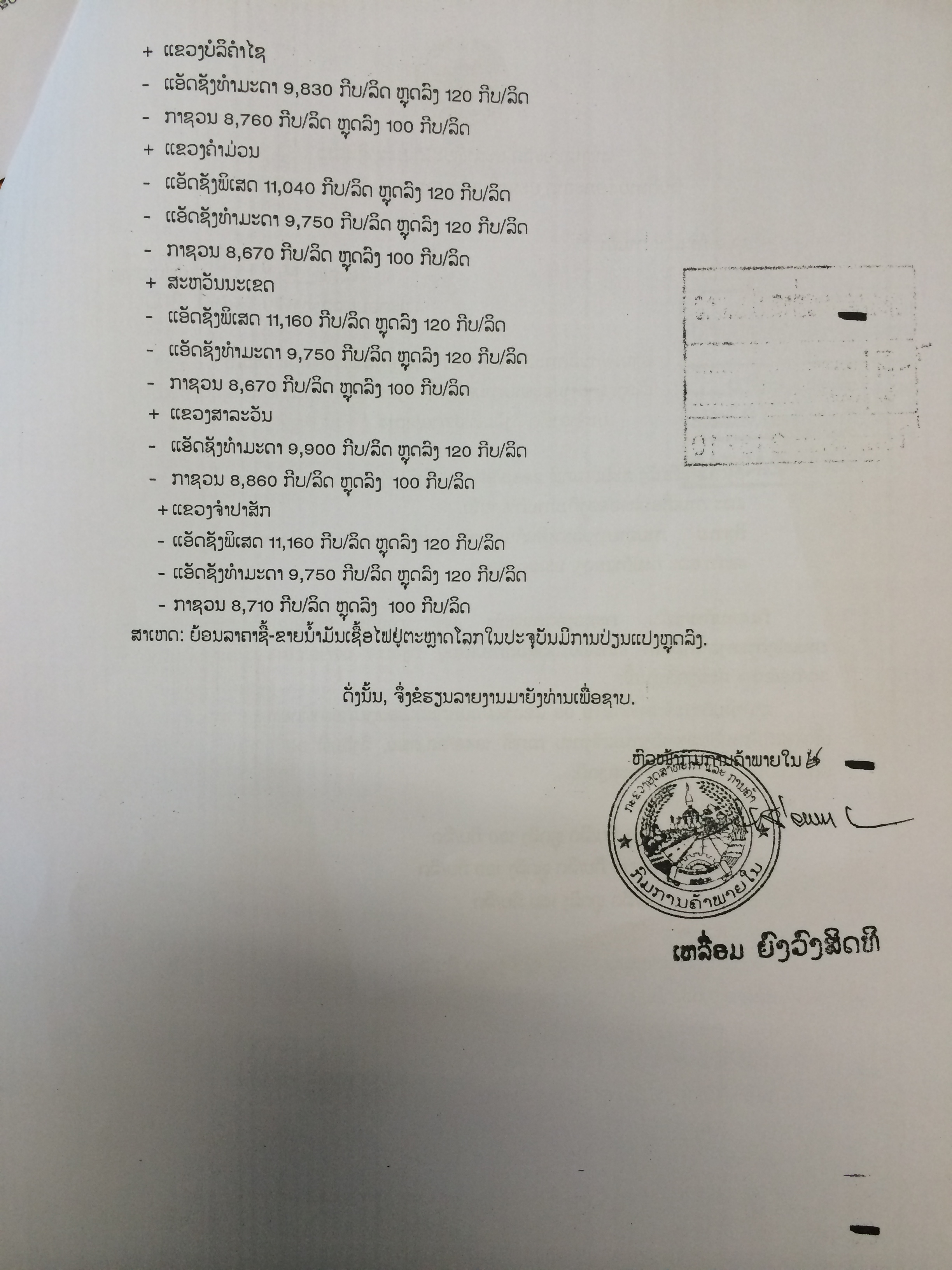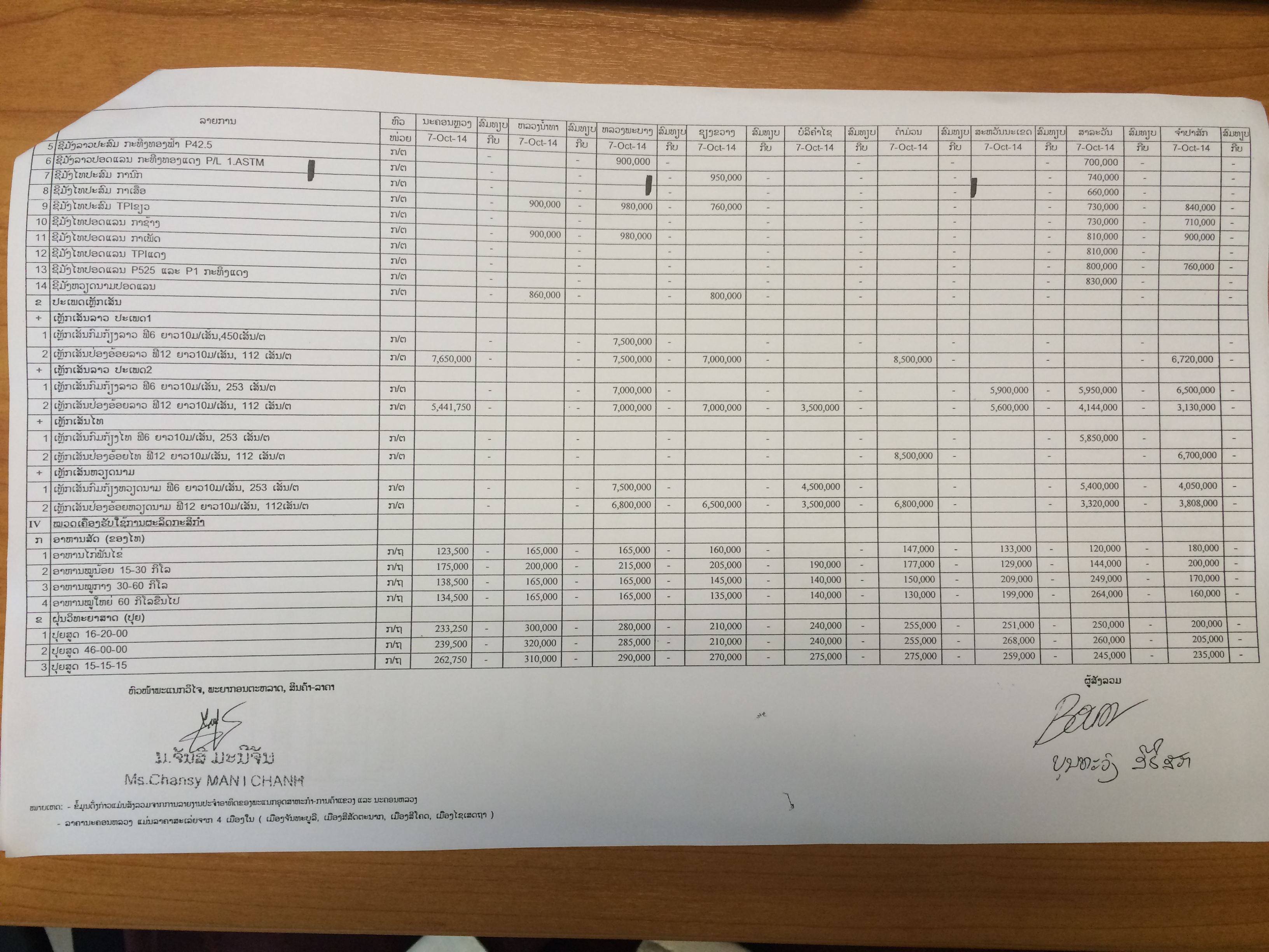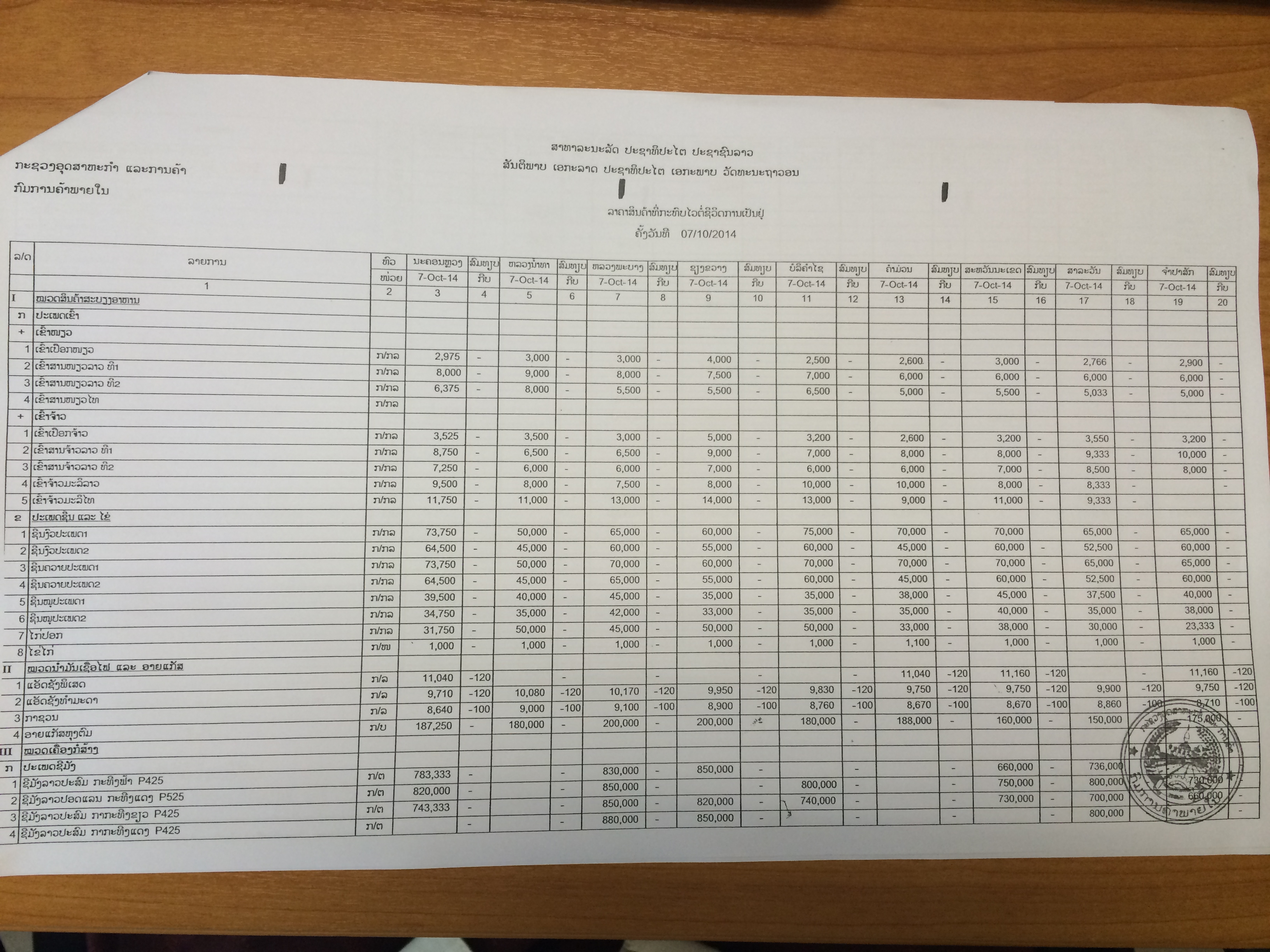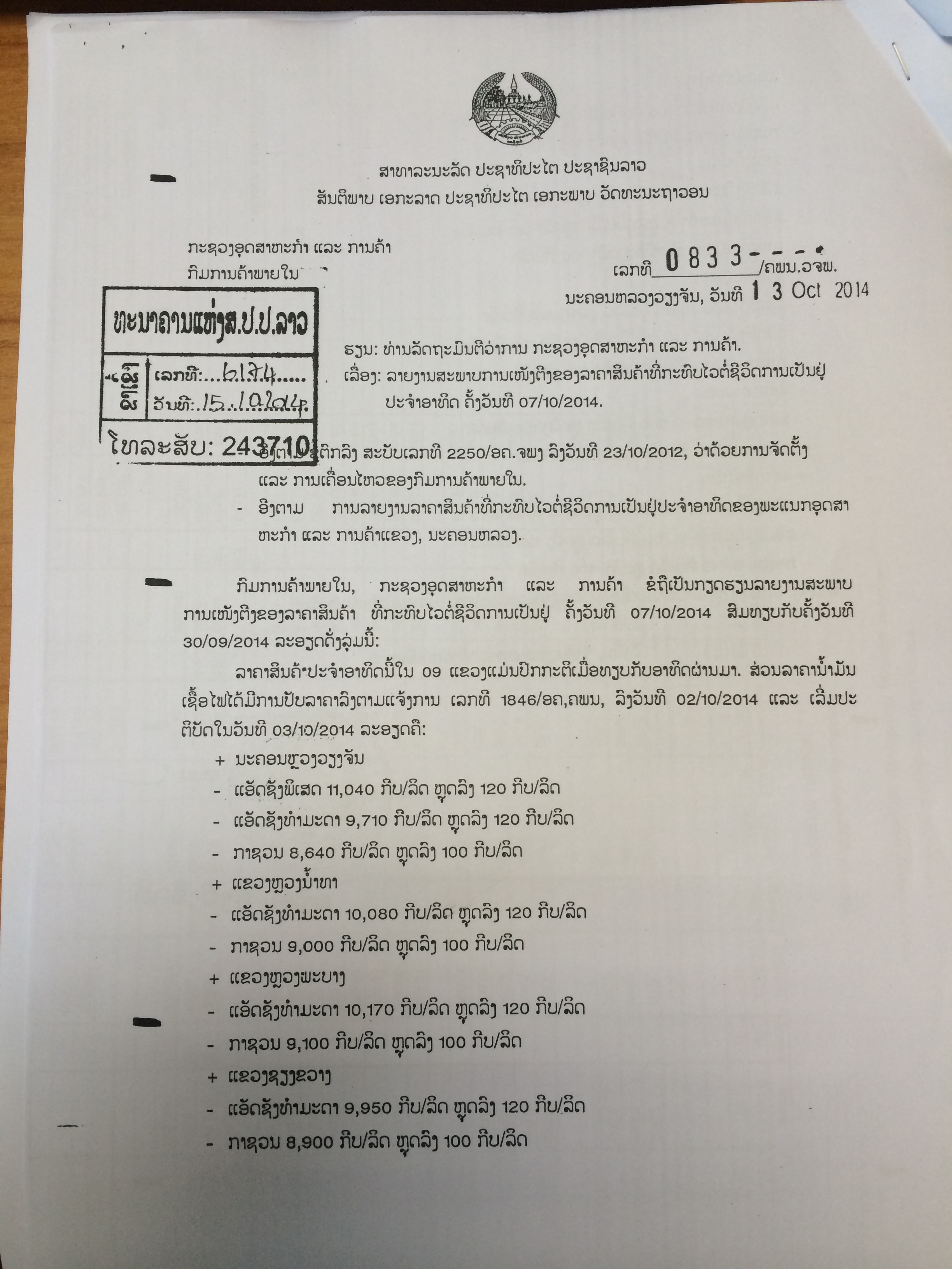 ລາຍງານສະພາບການເໜັງຕີງຂອງລາຄາສິນຄ້າທີ່ກະທົບໄວຕໍ່ຊີວິດການເປັນຢູ່ປະຈໍາອາທິດ ຄັ້ງວັນທີ 07/10/2014 |